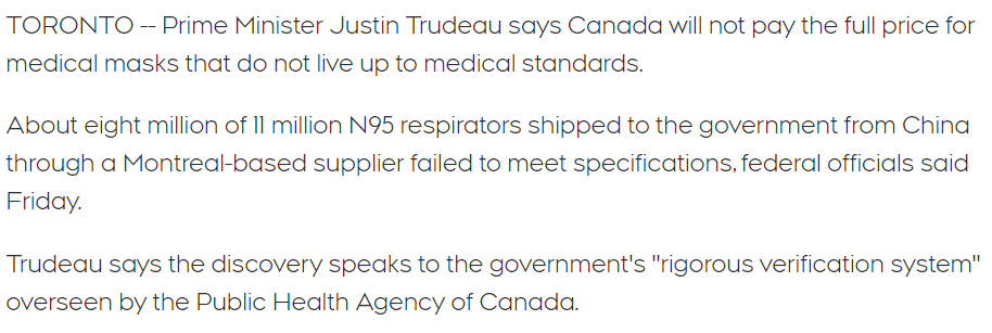 Justin Trudeau는 캐나다는 마스크 표준에 부응하지 않는 의료용 마스크에 대해 전액은 지불하지 않을 것이라고 말했다.