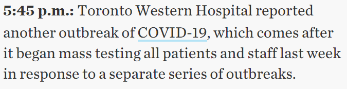 코로나 19의 또 다른 발생이 토론토 웨스턴 병원에서 보고되었다. 이 보고는 독립된 발생에 대한 대응으로 지난주 직원 및 환자를 대상으로 한 대량 테스트 이후에 발생했다.
