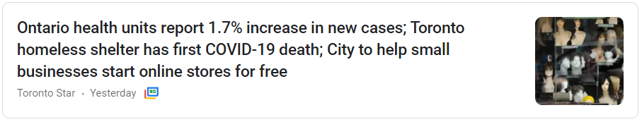 온타리오 보건부는 새로운 사례의 1.7%의 상승을 보고 했다; 토론토의 노숙자 보호소에 첫 코로나 19 사망자 발생; 시에서 작은 사업의 온라인 스토어 시작을 무료로 돕다.