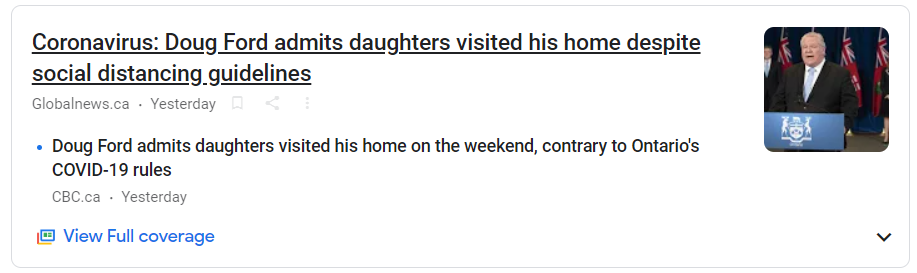더그 포드는 딸들이 그의집을 주말에 방문한것을 인정했다. 온타리오의 코로나 19 규칙에 반하여