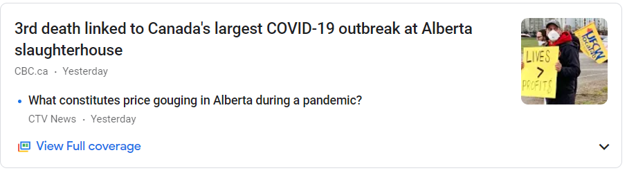 알버타의 도축장에서 캐나다의 가장 큰 코로나 19 발생과 연관된 세번째 죽음.