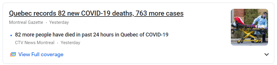 퀘백 새로운 82개의 새로운 코비드 19 사망 기록, 763개의 추가사례들